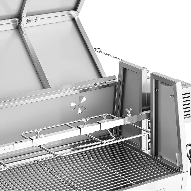 Construída em aço inoxidável de alta durabilidade, esta churrasqueira é resistente à corrosão e extremamente fácil de higienizar. Com uma impressionante capacidade de carga de até 60 kg, o espeto de 1168 mm oferece espaço suficiente para os banquetes mais ambiciosos. A sua estrutura funcional permite um controlo térmico preciso através de 4 níveis de altura ajustáveis, garantindo que a carne esteja sempre à distância ideal das brasas.